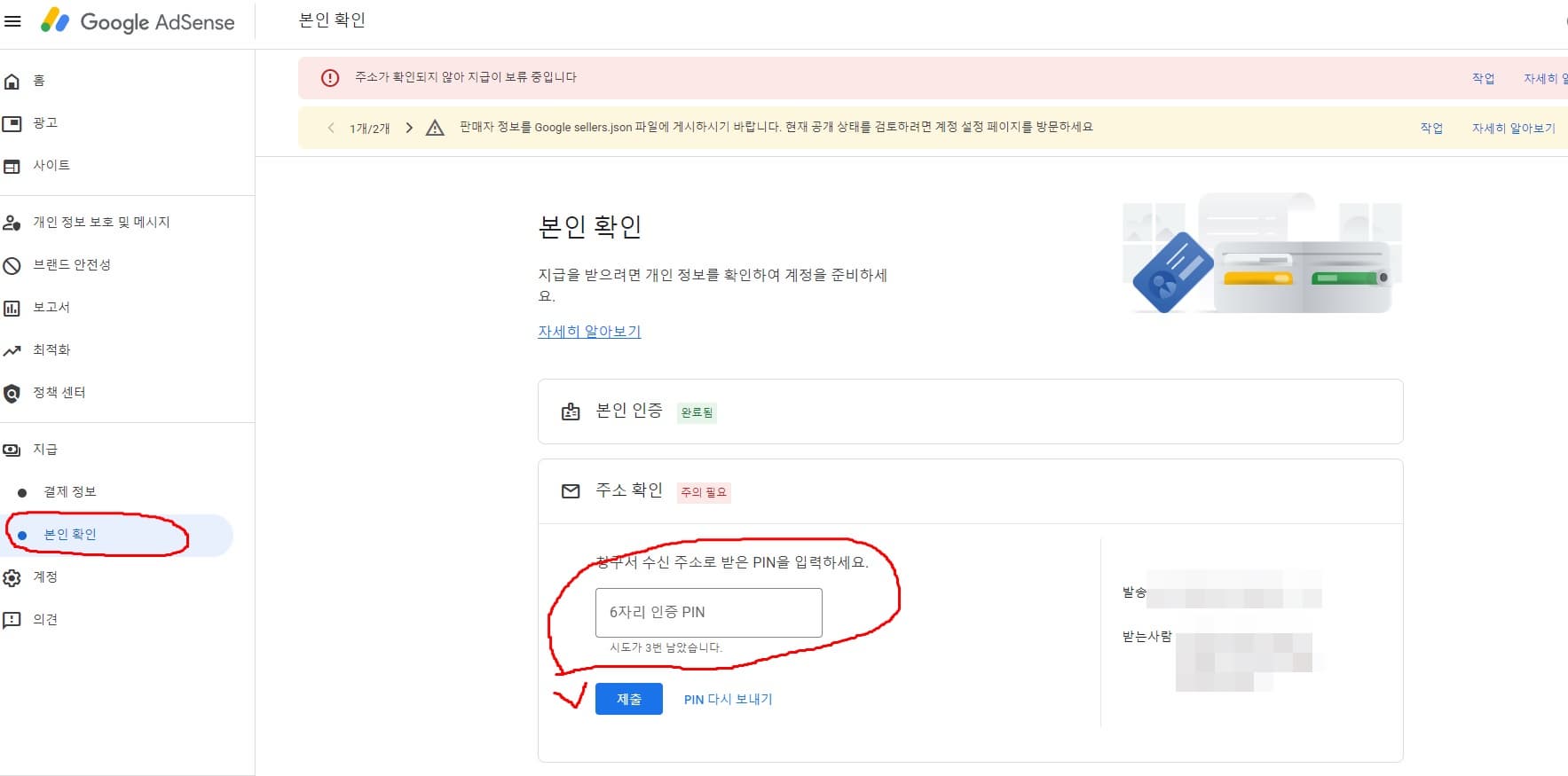 PIN 핀 번호가 기록된 우편물을 받으면 4개월 이내 구글 에드센스에 핀 번호를 등록해야 합니다.