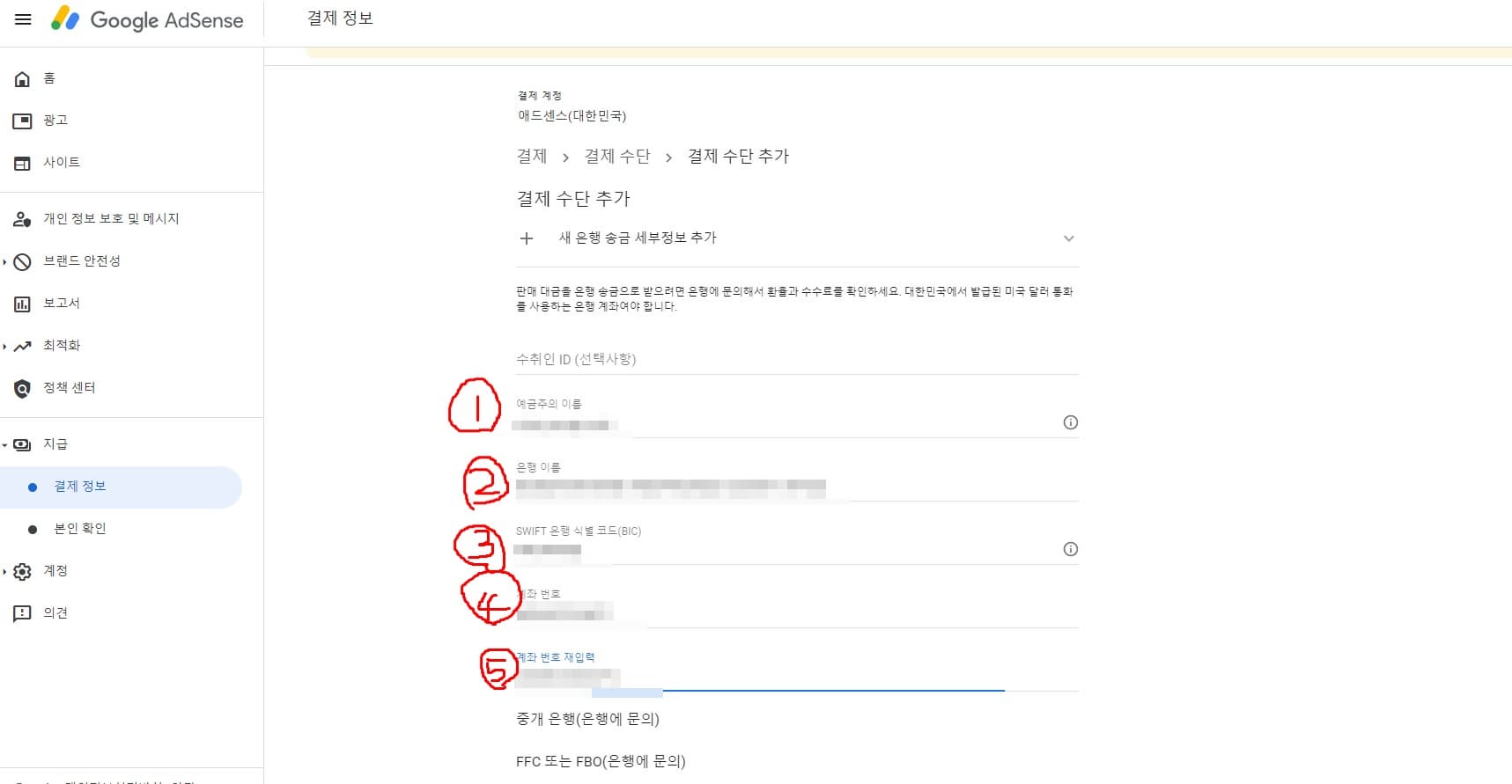 예금주 이름, 은행이름, swift cood, 계좌번호 등 꼼꼼하게 입력합니다