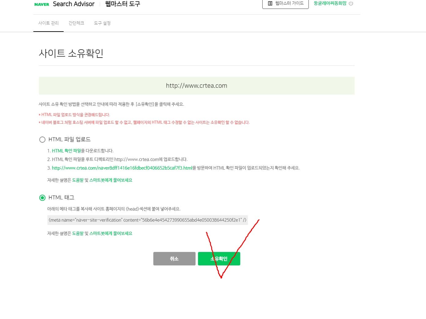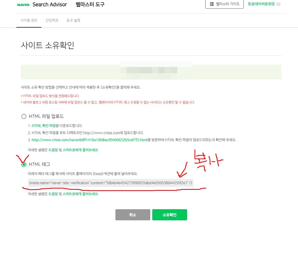⑦ 다시 네이버 서치어드바이저로 돌아가서 소유확인을 클릭합니다