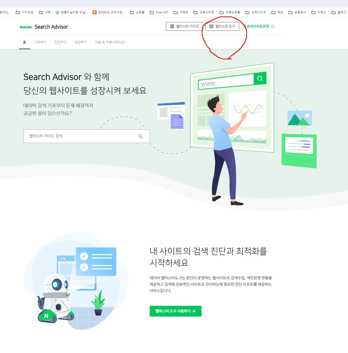 ① 네이버 검색창에 「서치어드바이저」를 검색 후 웹마스터 도구를 클릭합니다